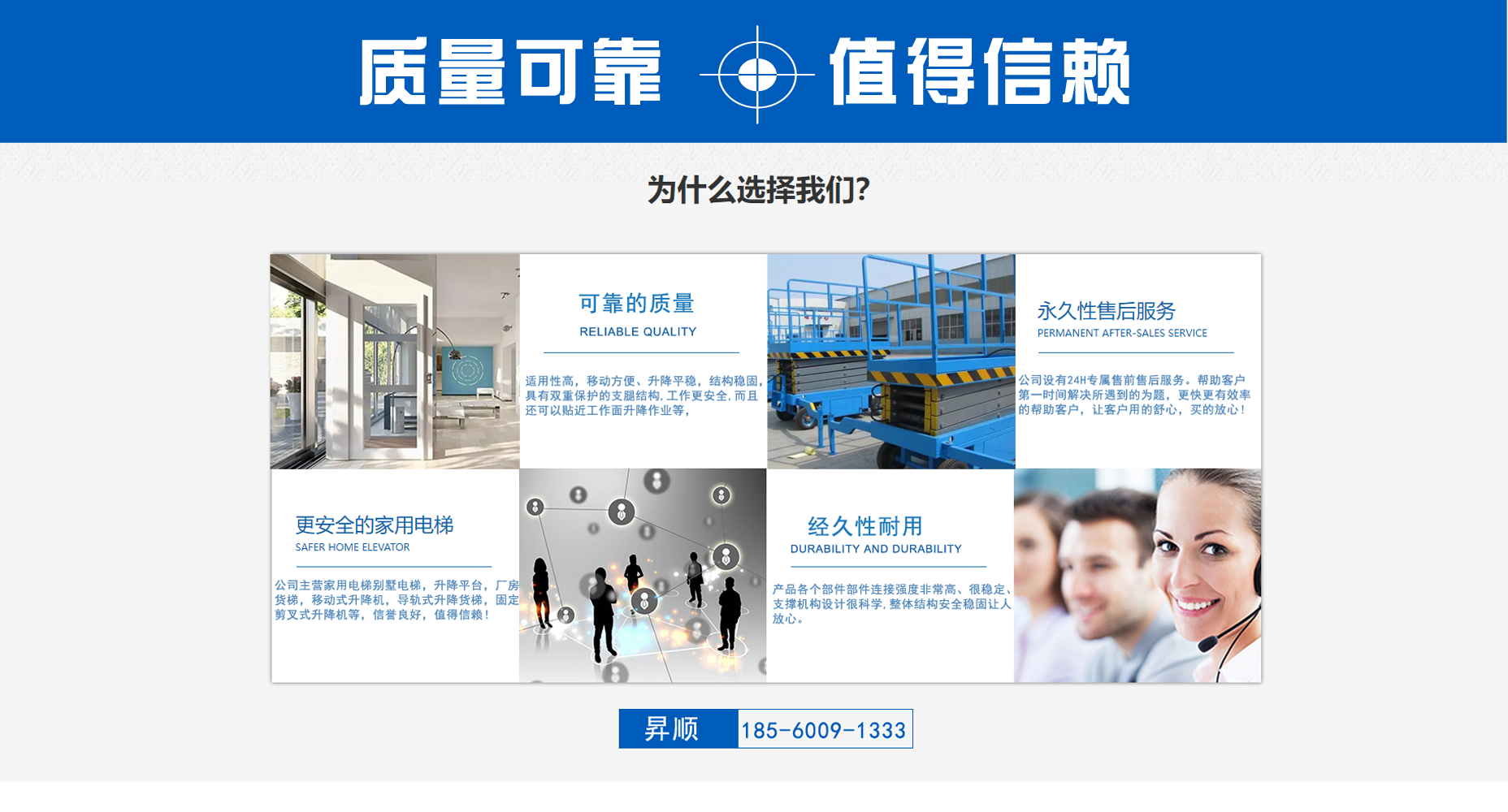 山東昇順液壓升降機械有限公司是一家主營家用電梯,別墅電梯,升降平臺,廠房貨梯,移動式升降機,導軌式升降貨梯,固定剪叉式升降機等產品企業,質量可靠,值得信賴。 用戶至上,以用戶為中心”是公司永遠堅持的服務宗旨,贏得用戶的贊許是我們的榮譽,及時滿足用戶的需求,是我們公司的愿望。長期以來,公司員工以優質的服務,取悅于用戶,以誠信的言行取信于用戶,得到了用戶們的好評。我們期待著與您更加愉快的合作!公司的發展,離不開社會的大力支持,在社會的支持和幫助下,我們正昂首闊步邁向未來! 我們的經營方針是:以質量求生存,以產品求發展,以信譽保合作,以服務贏客戶。 本公司對產品質量和各項服務恪守合同承諾,并愿與新老客戶精誠合作,共創未來?! 」揪瘢簞撔率侵黝},超越是不懈的追求。 公司宗旨:信譽保證,誠信為本?! ∥覀儠院侠淼膬r格,良好的信譽,雄厚的實力,優質的產品,最周到的服務,服務于廣大新老客戶!...